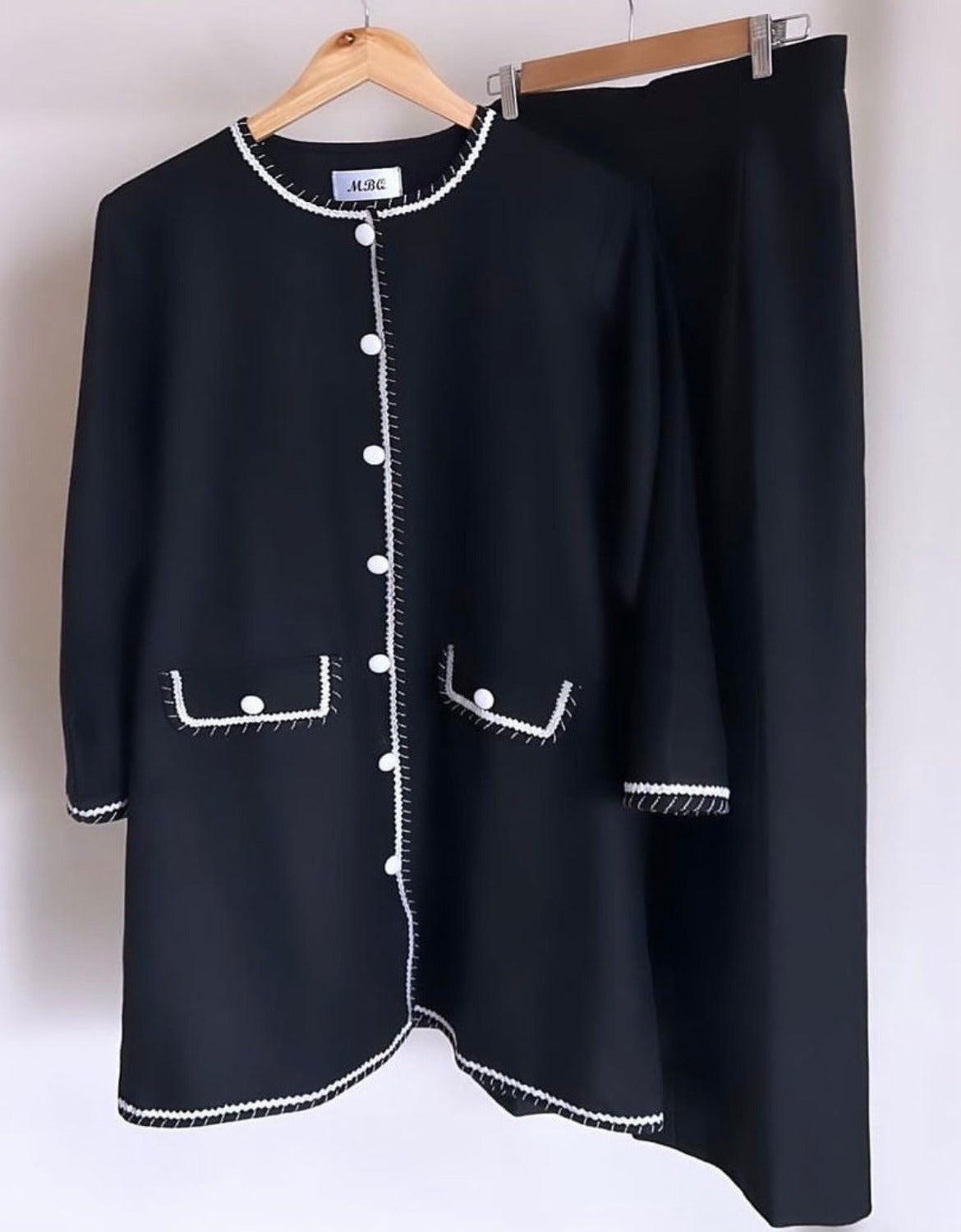 A Co-ord set with a jacket-style front open top adorned with scallop embroidery on the pockets and front. This combination creates a stylish look for various occasions, from daytime events to evening gatherings.