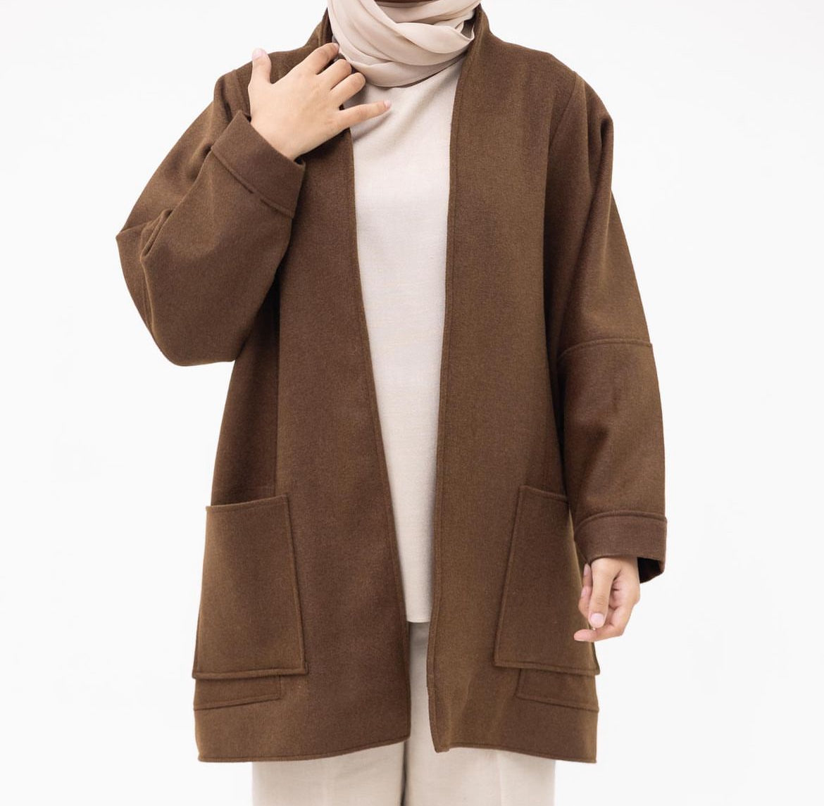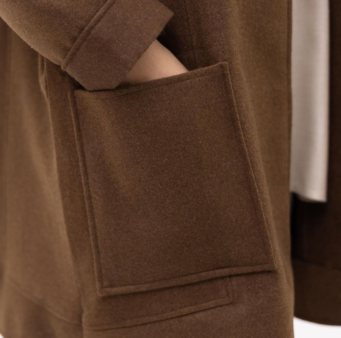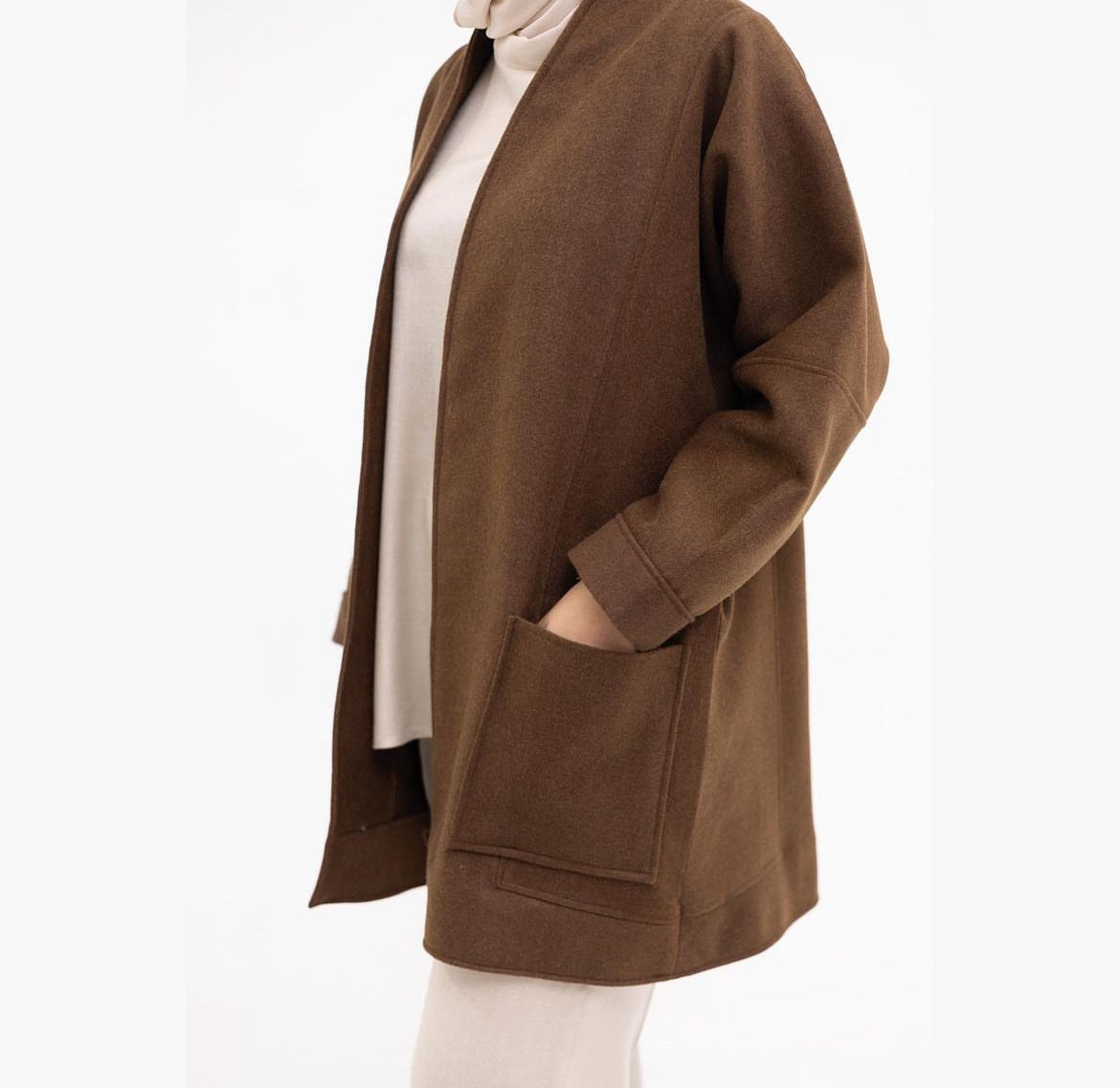 A short coffee brown coat featuring a modern silhouette with double square pockets. It's both functional and chic, perfect for any occasion.