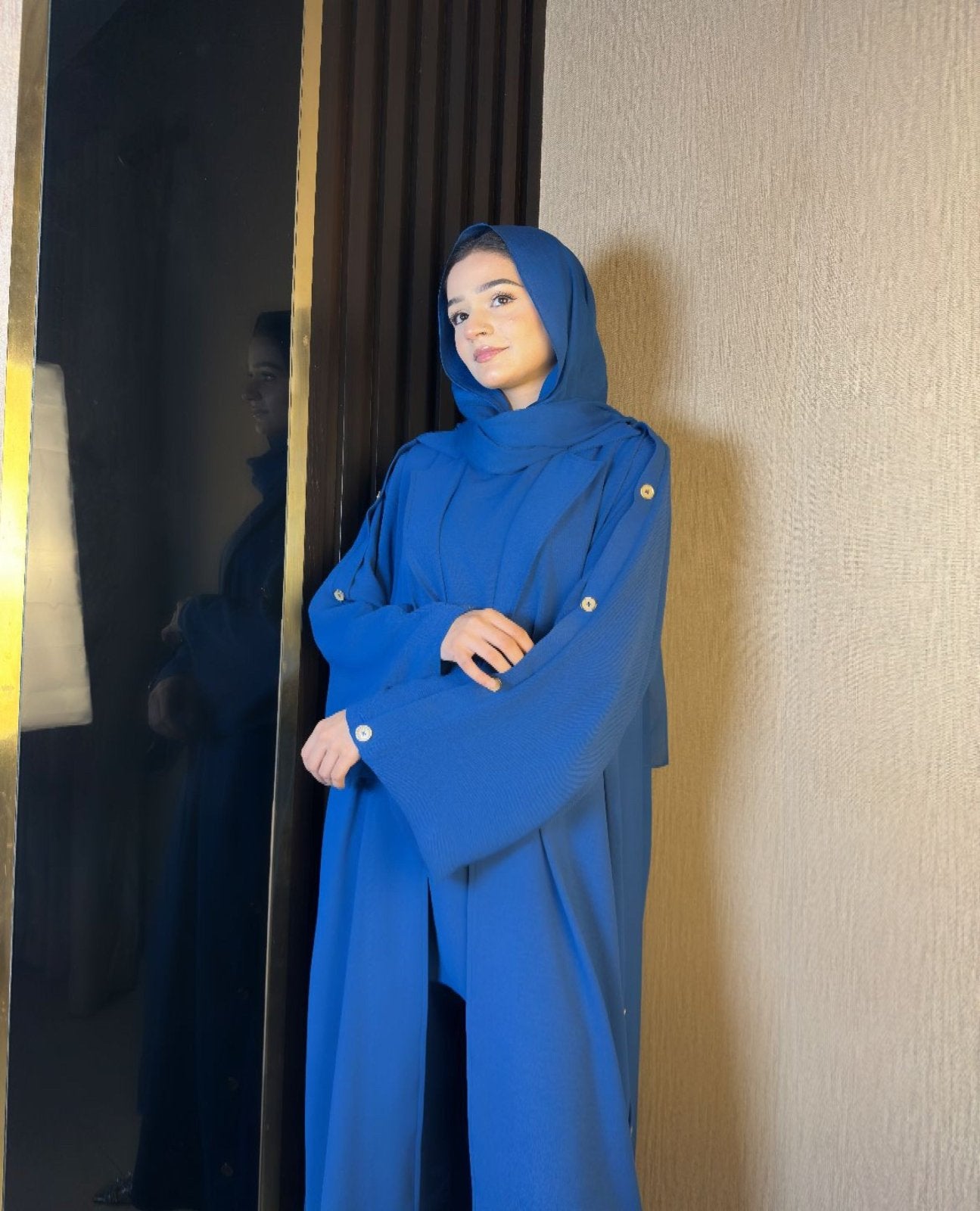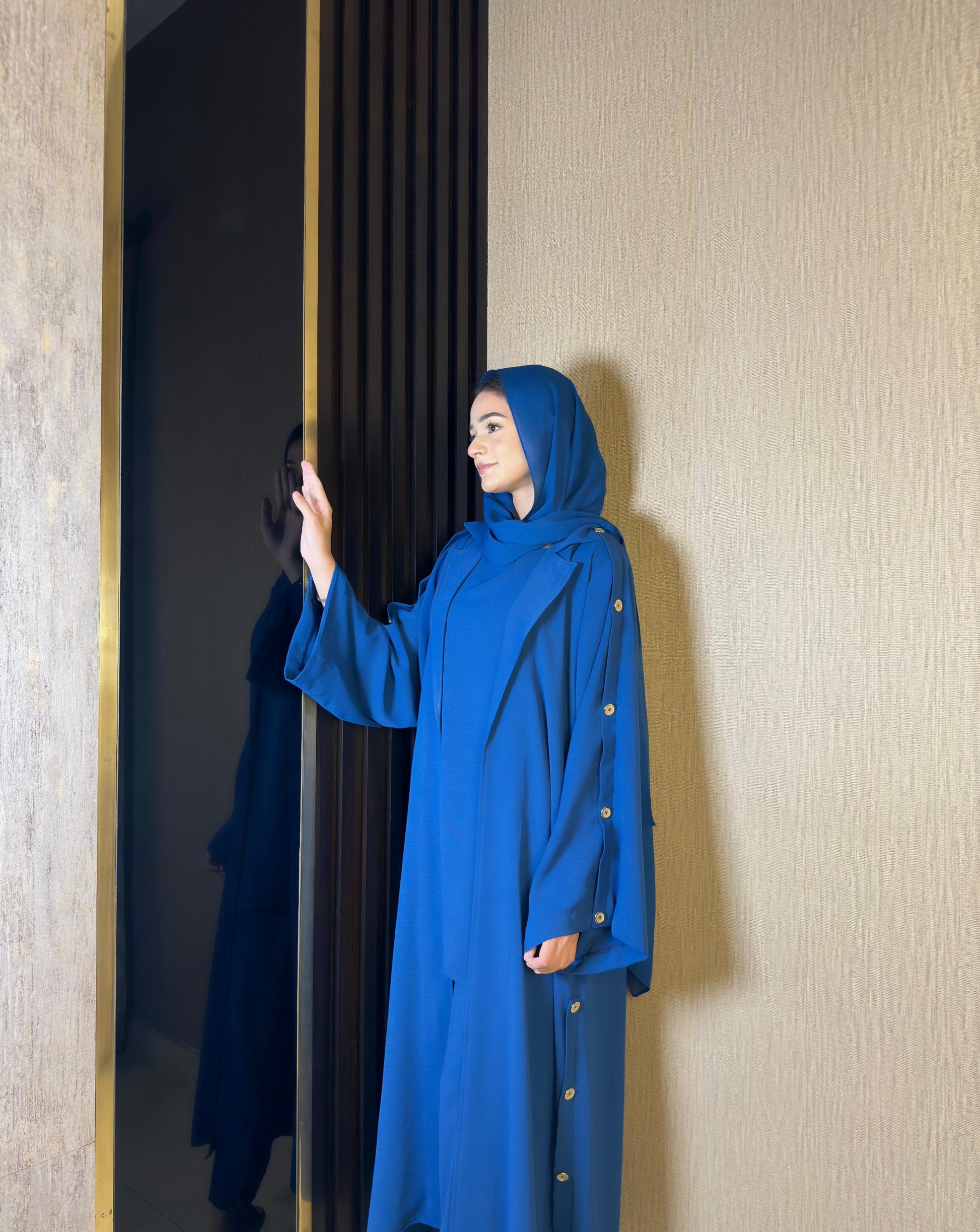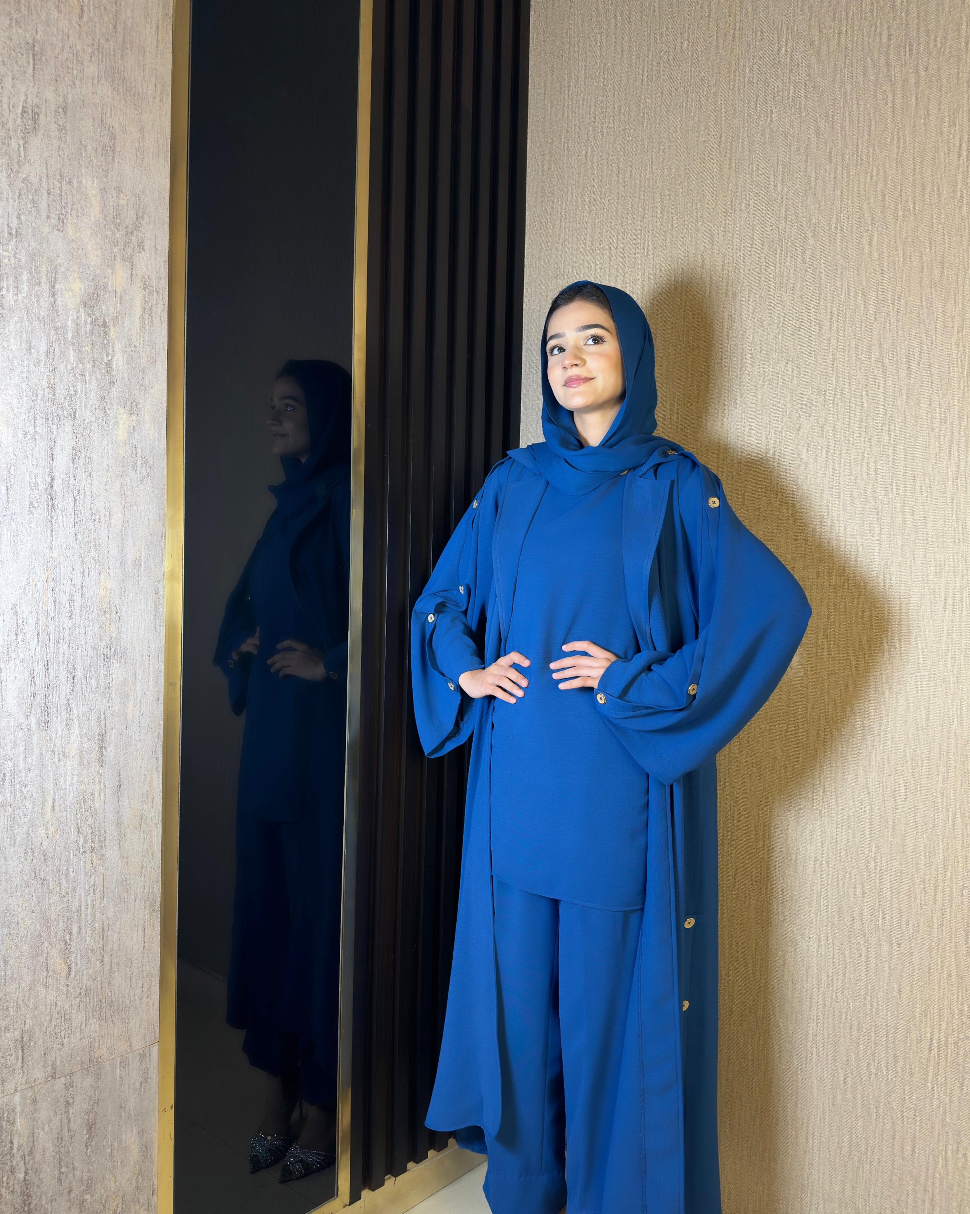 The Dia 3-piece set includes an outer, sleeveless inner shirt, and tapered pants/culottes, featuring chunky buttons on the sleeves and sides, combining style with practicality