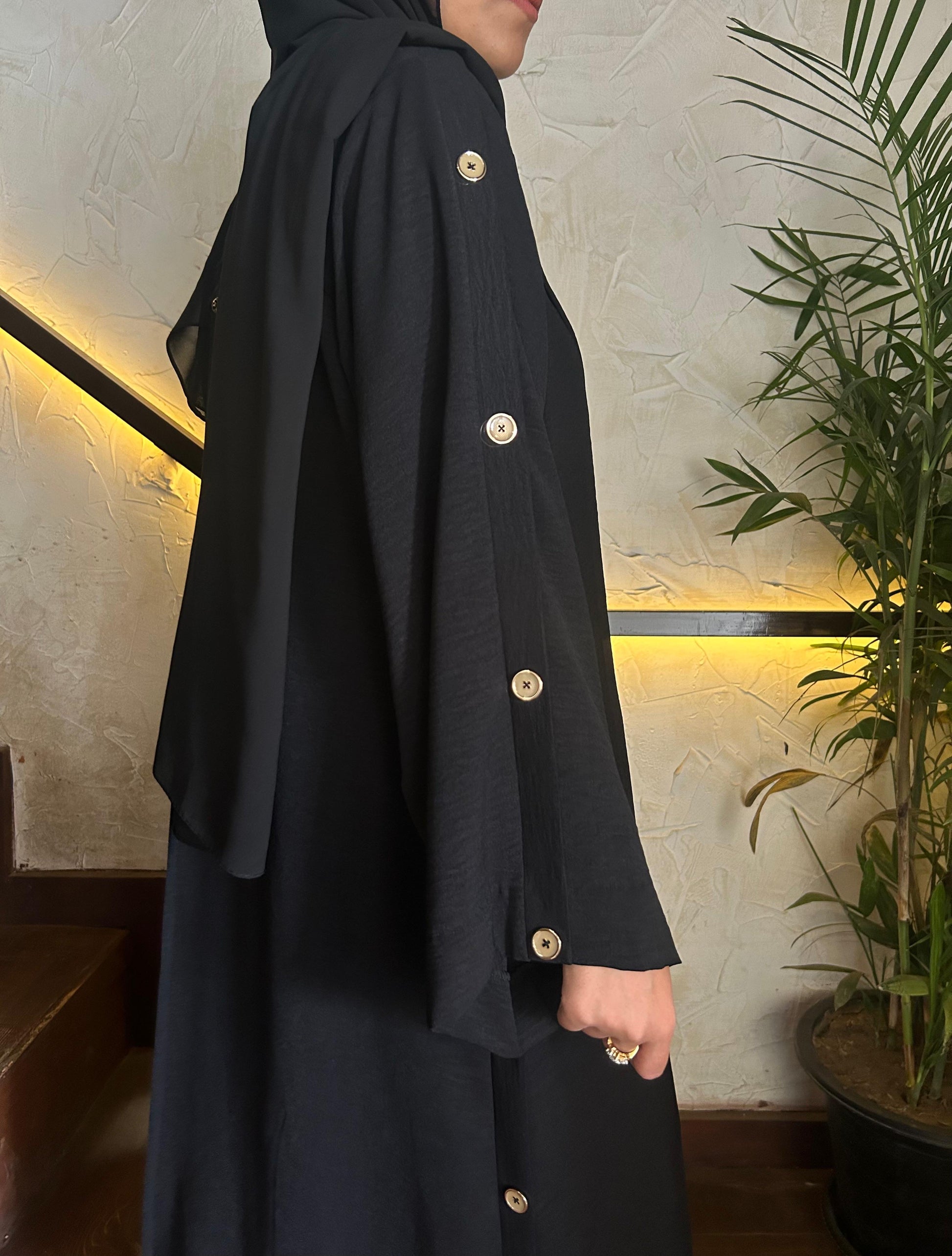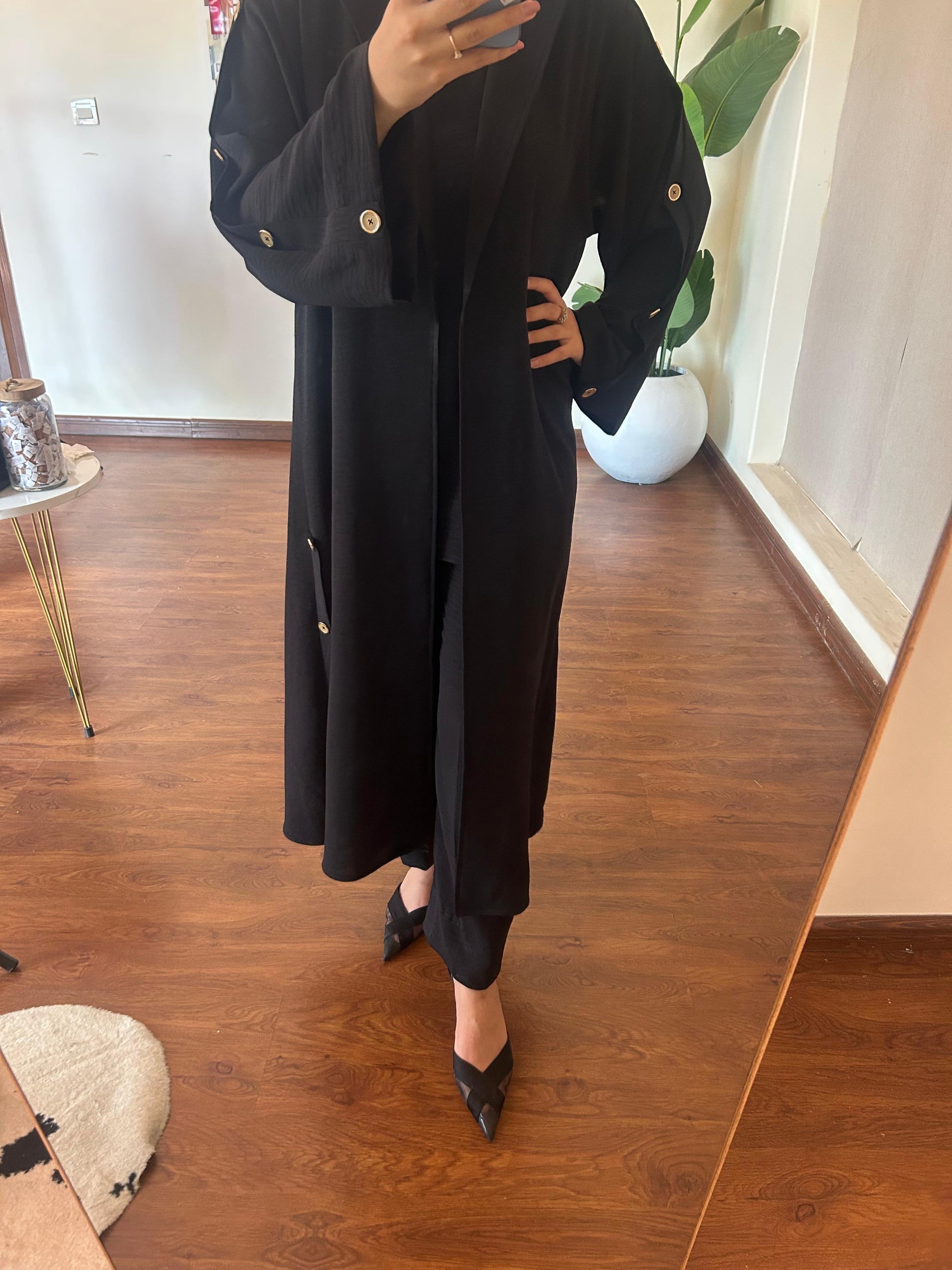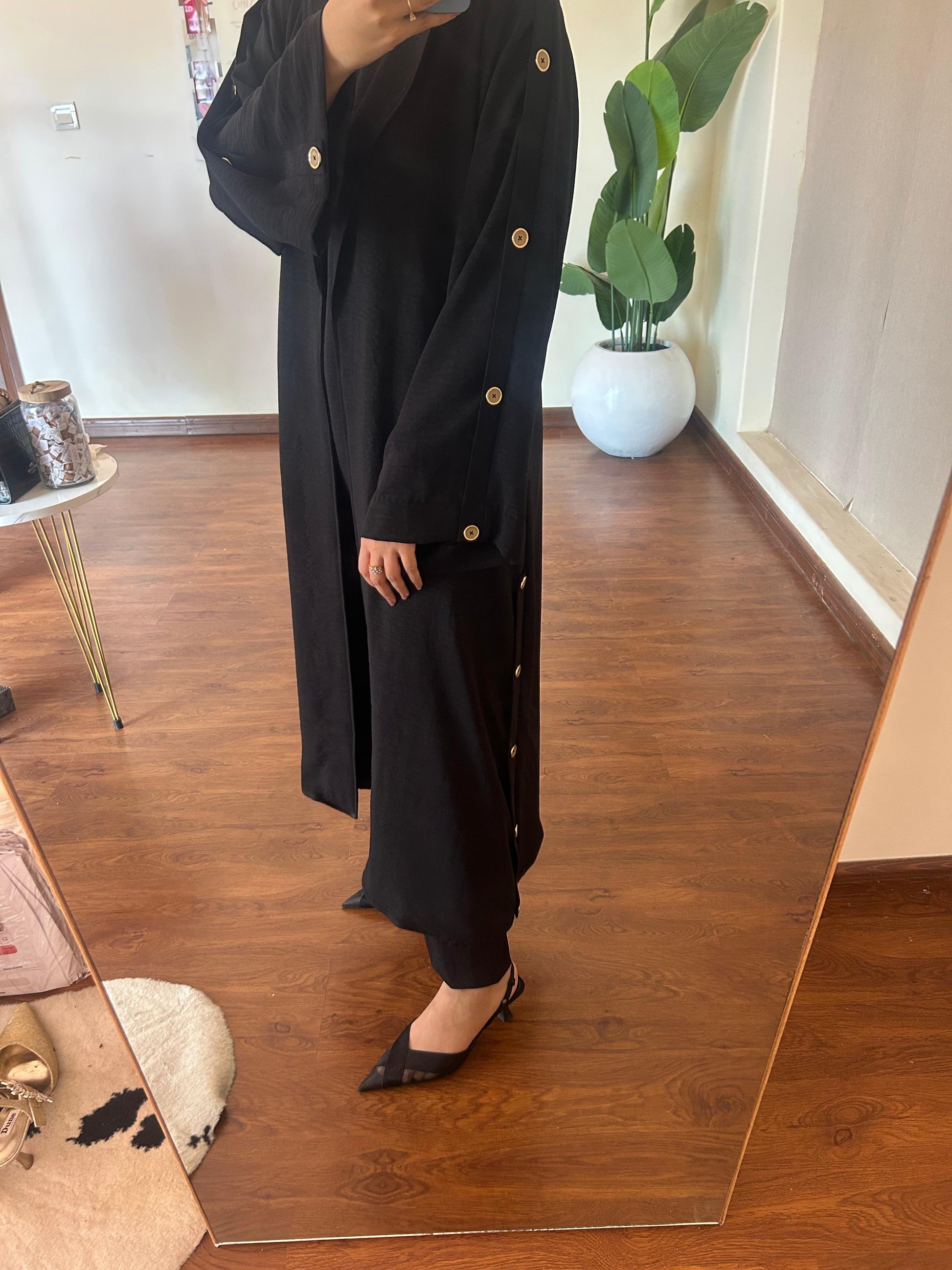 The Dia 3-piece set includes an outer, sleeveless inner shirt, and tapered pants/culottes, featuring chunky buttons on the sleeves and sides, combining style with practicality