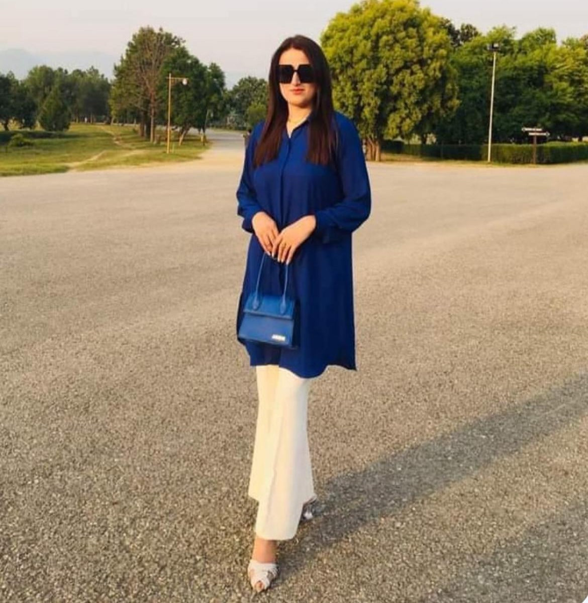 An electric blue top balances vibrant color with simplicity for a stylish look.