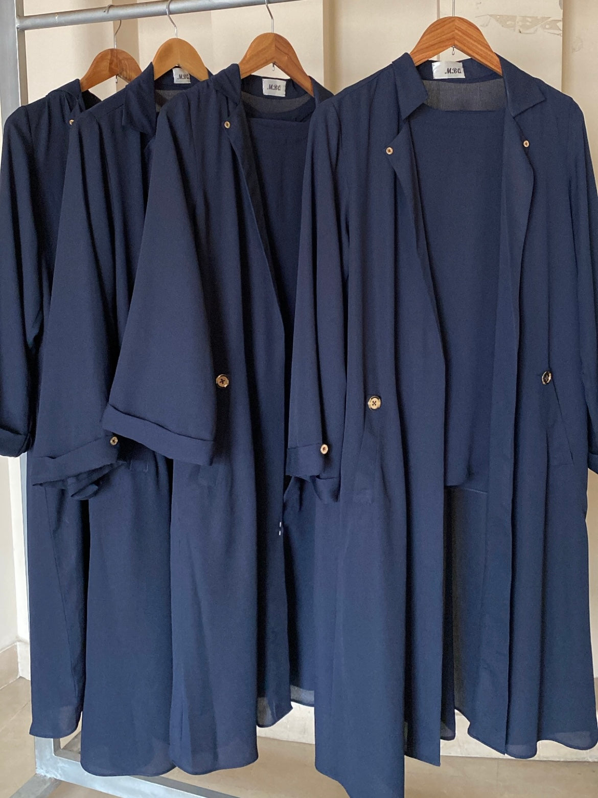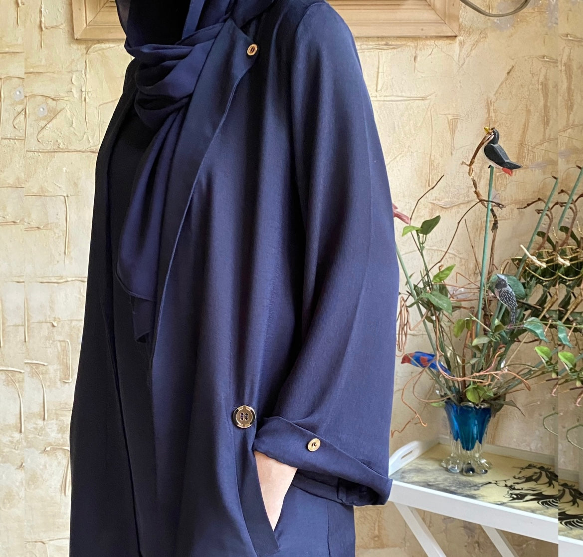 The Eve 3-piece set includes an outer, sleeveless inner shirt and tapered pants/culottes, showcasing elegance with its tailored design, featuring buttons on the pockets, neck and sleeves, complemented by the option to customize with tapered pants.