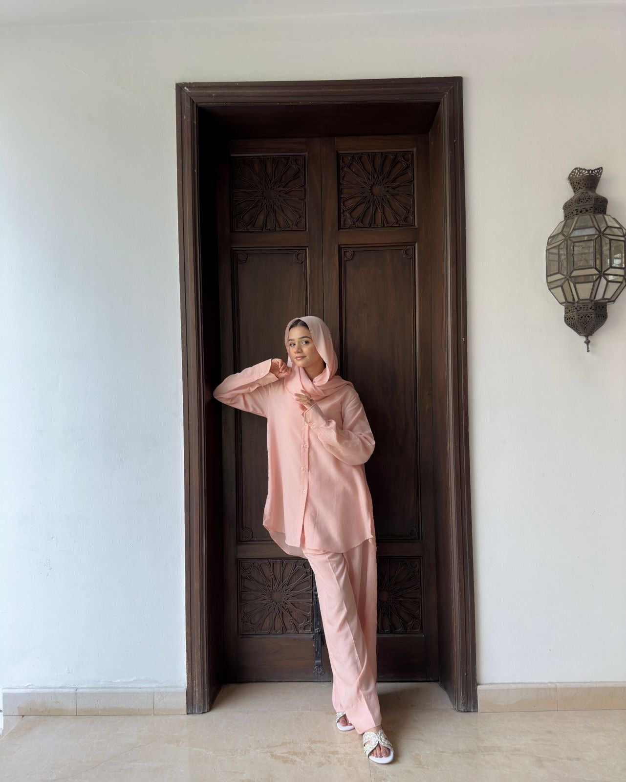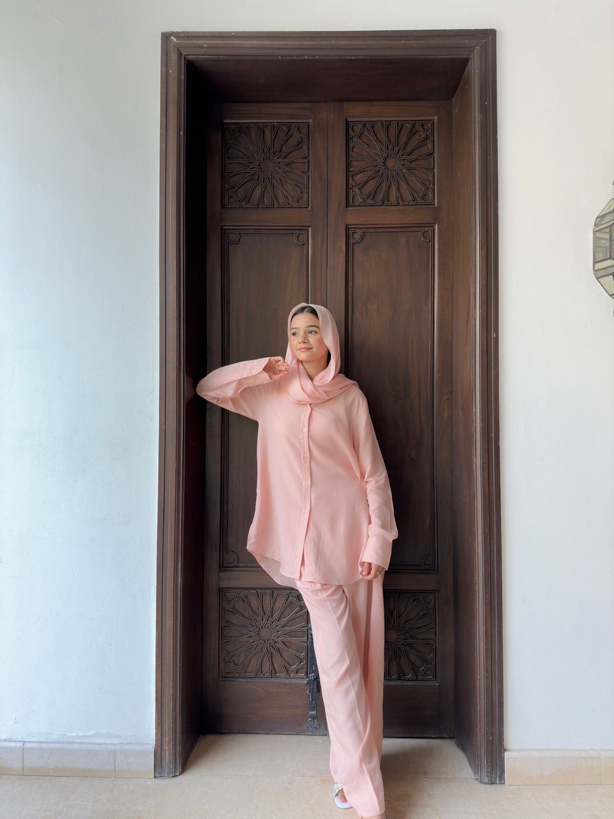 Introducing our Salmon Pink Irish Linen Set. Crafted from breathable Irish linen, it's perfect for summer. Stay cool, comfortable, and stylish with this elegant, lightweight ensemble.