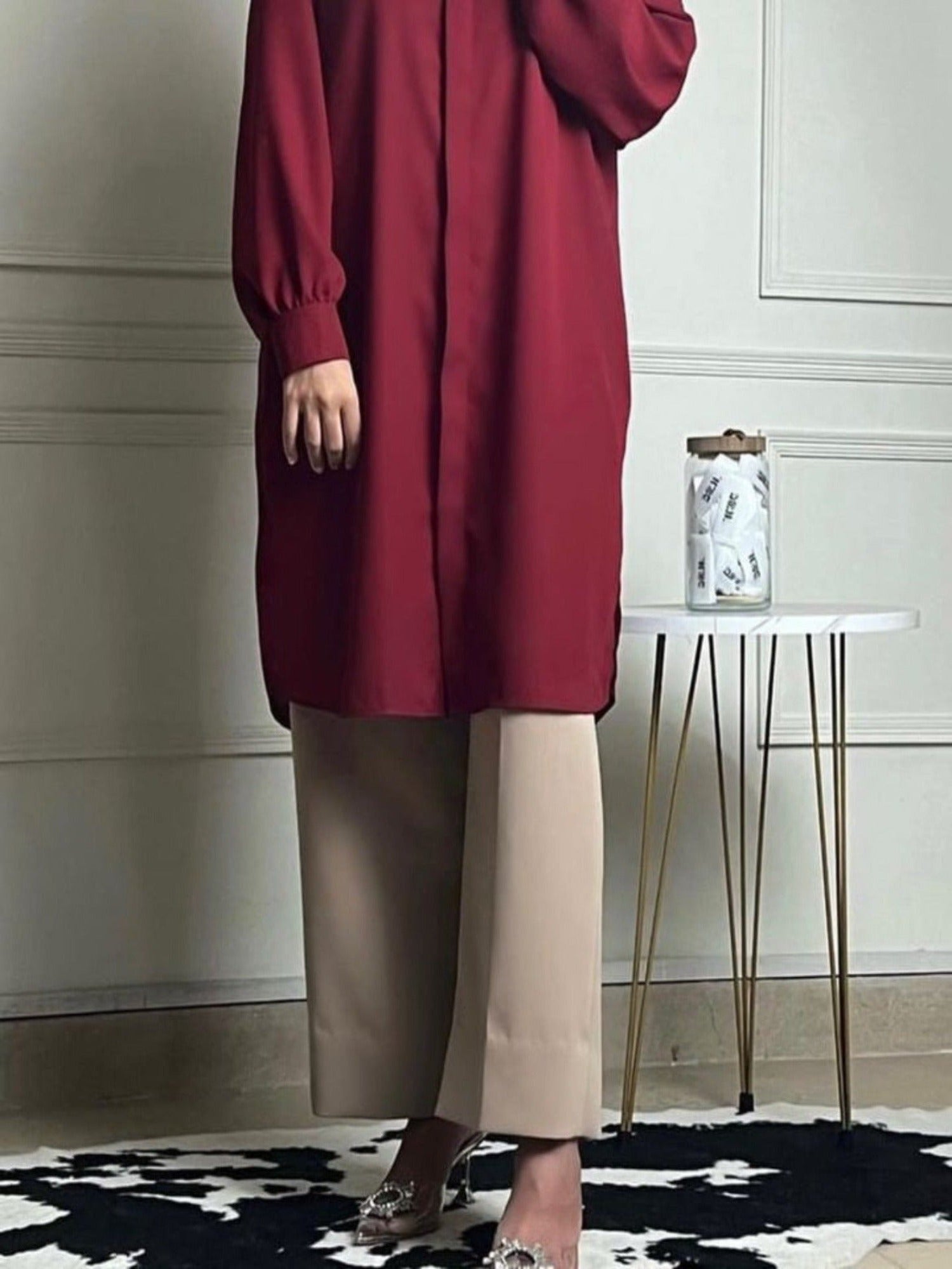 This maroon top creates a chic and balanced outfit, combining rich color with a neutral tone.