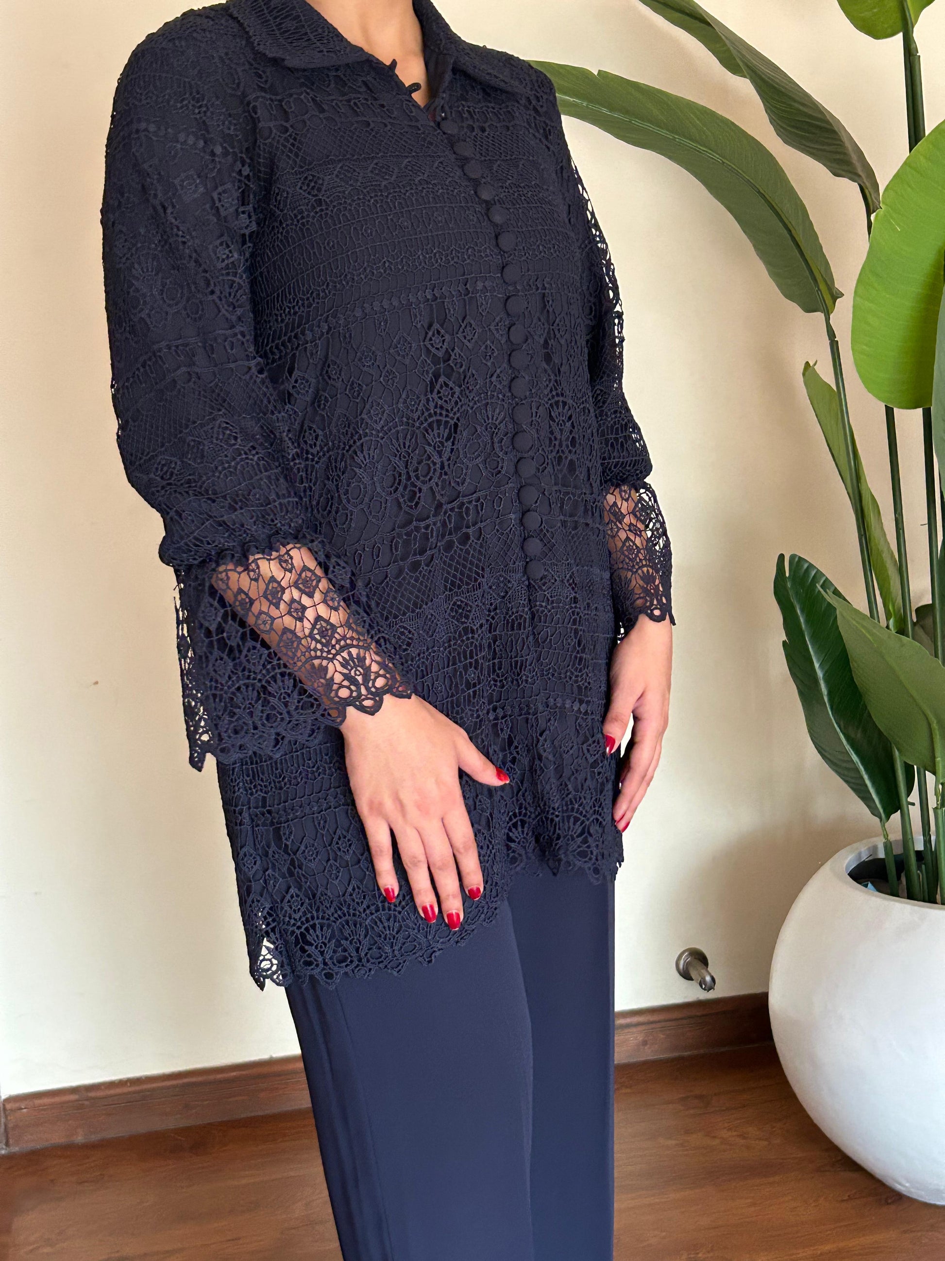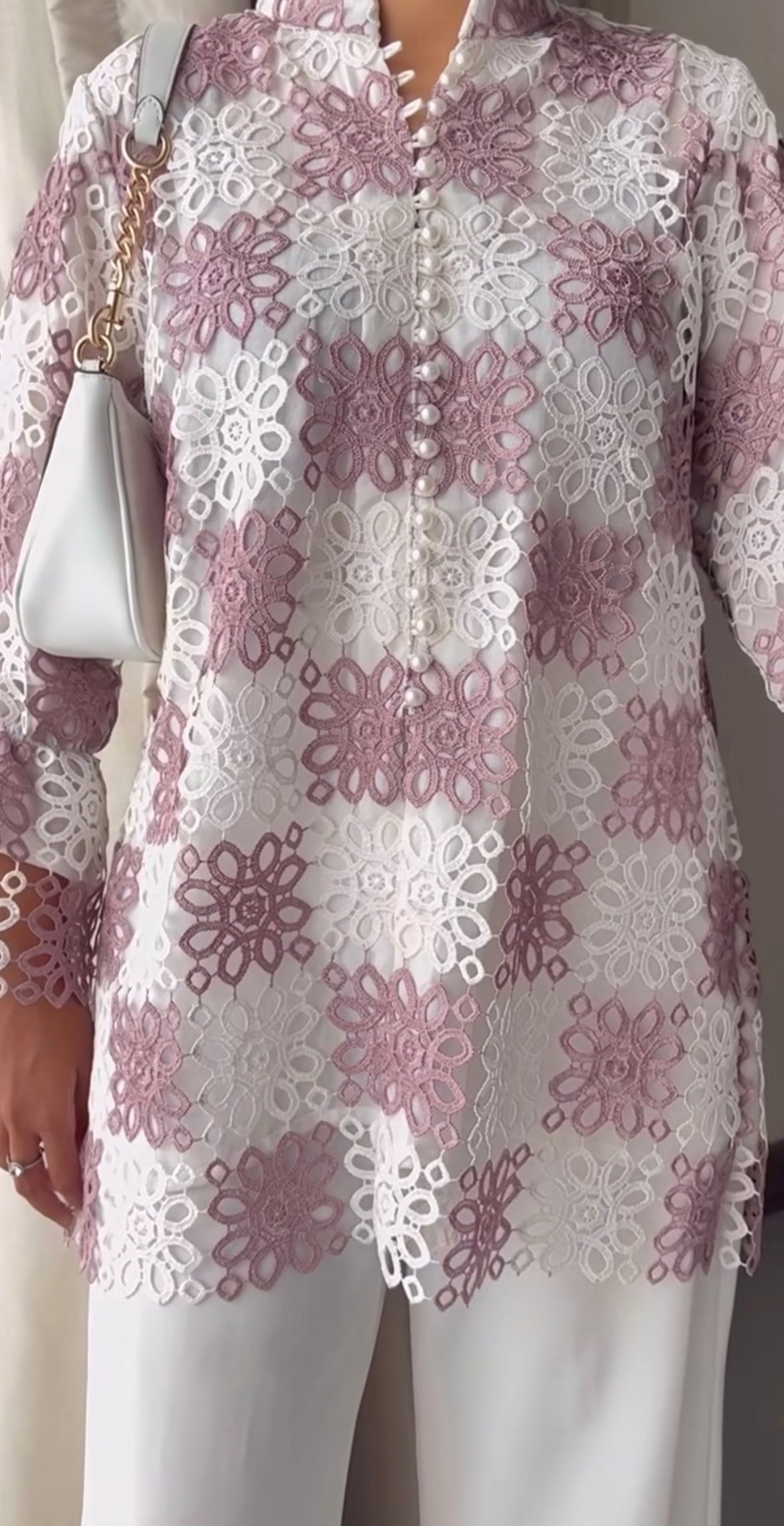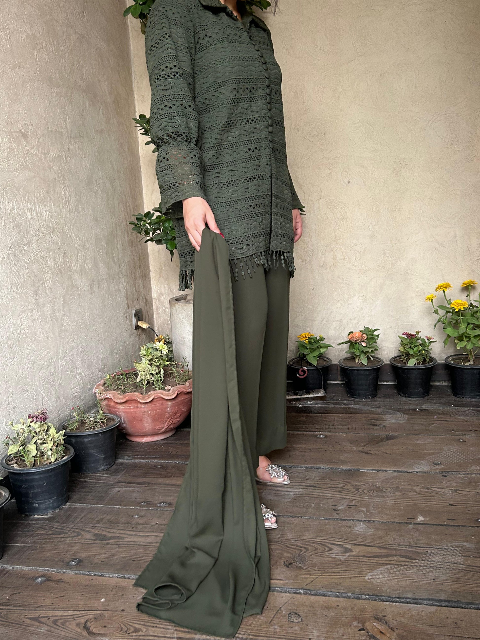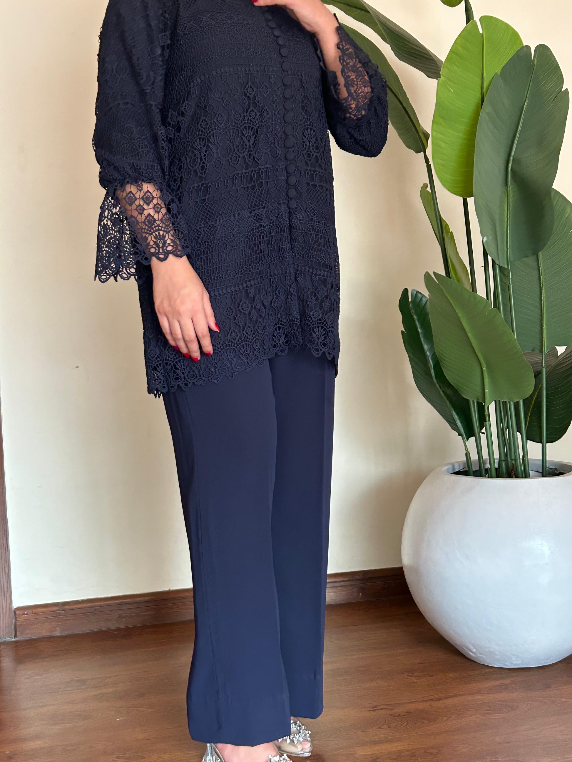 This crochet net top serves as a statement piece, adding intricate detail to the ensemble.