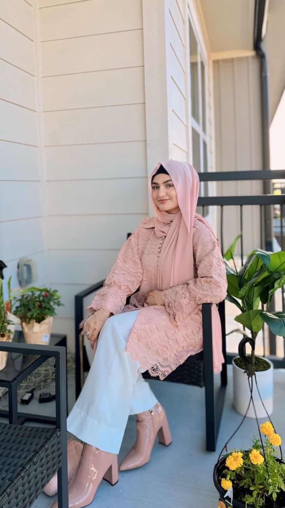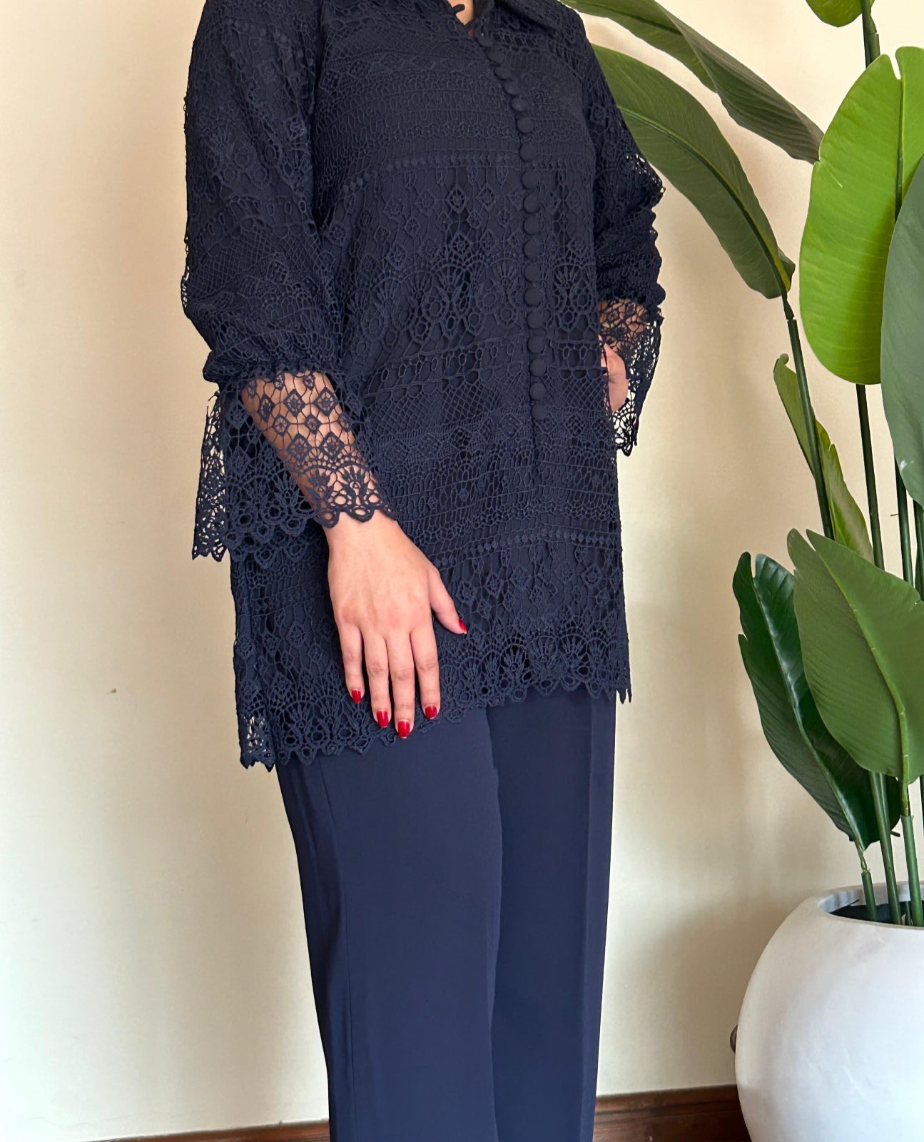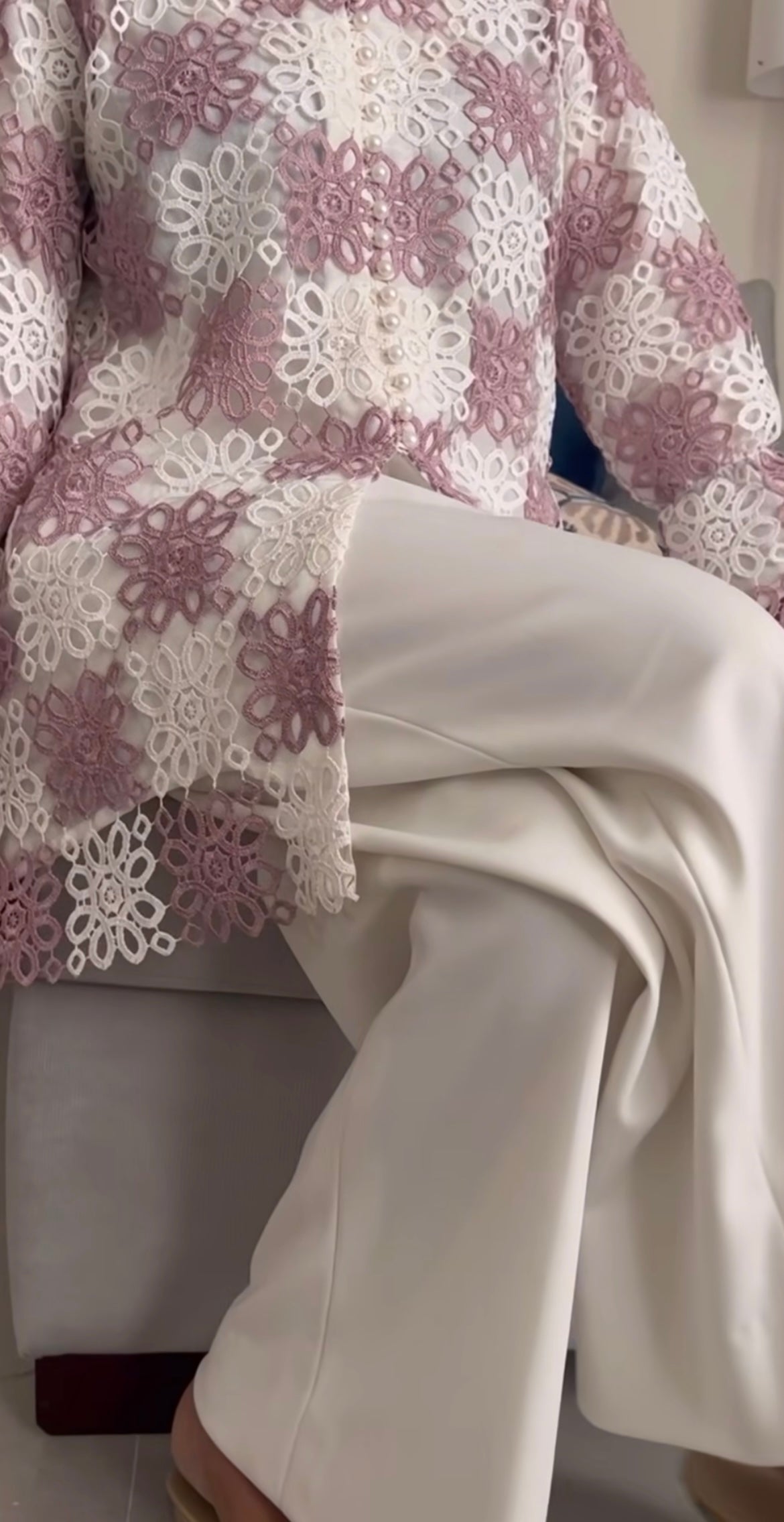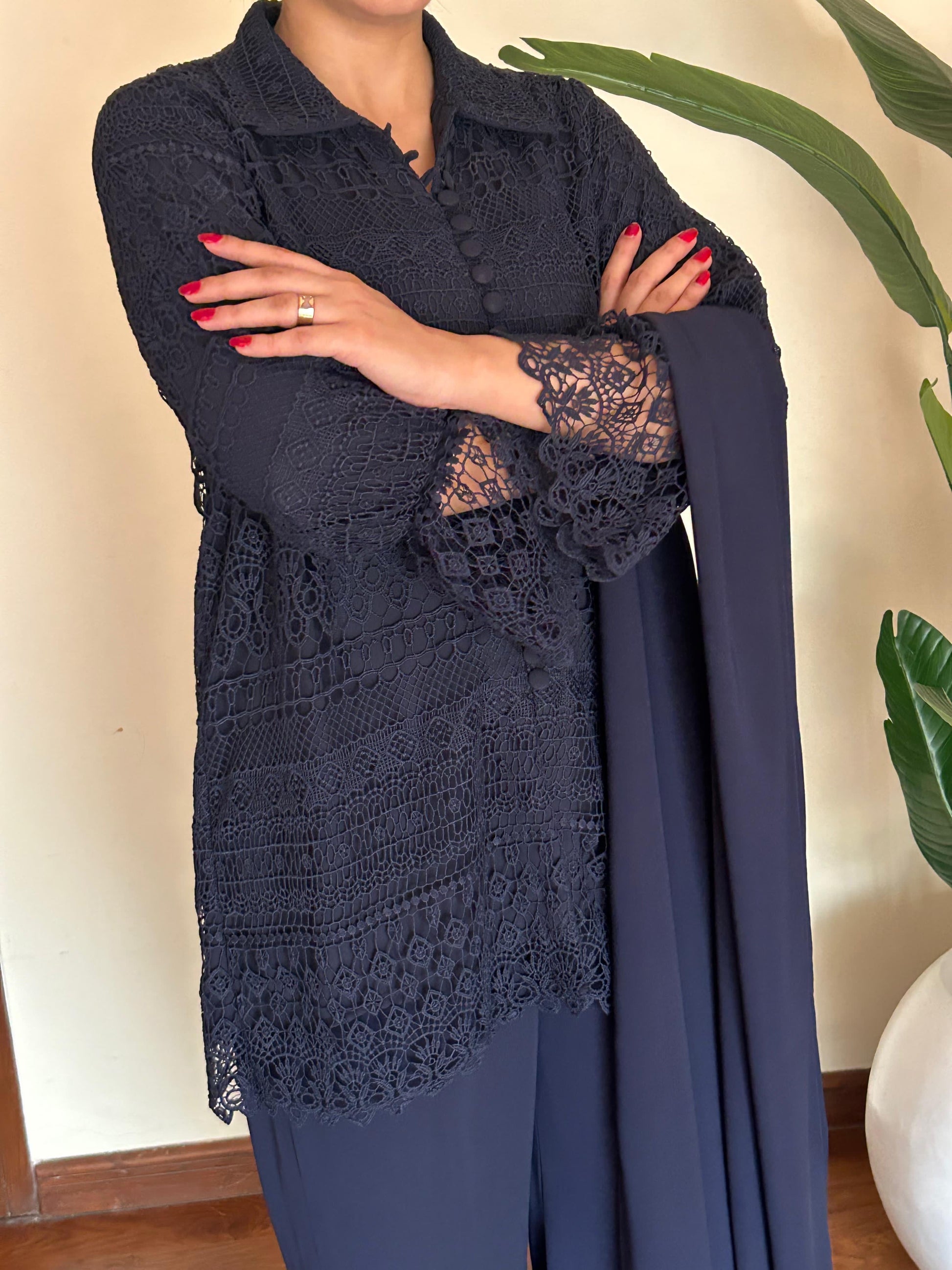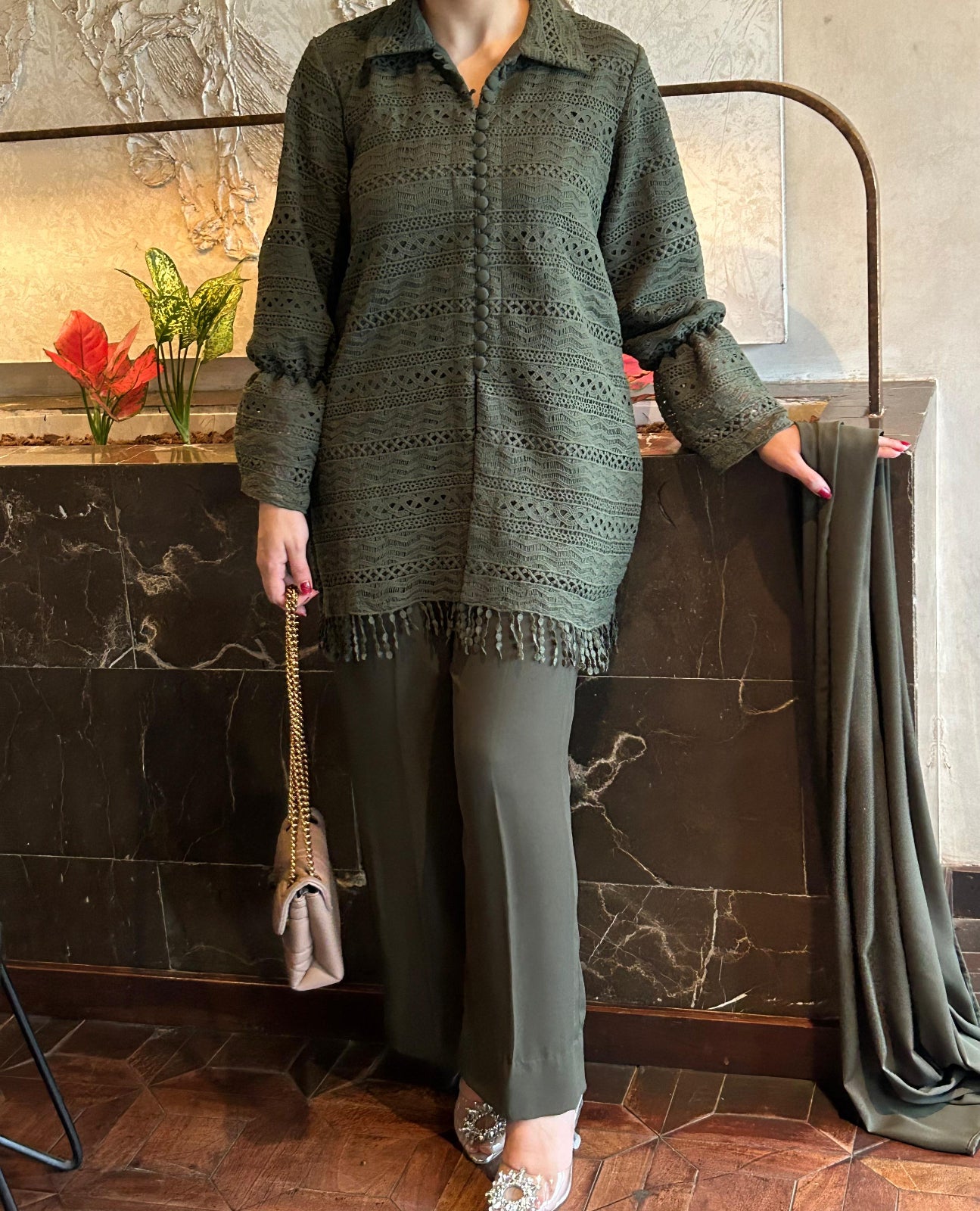 This crochet net top serves as a statement piece, adding intricate detail to the ensemble.